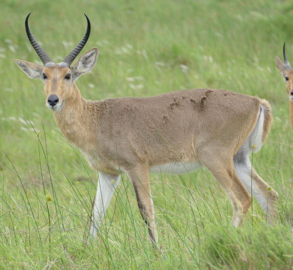 Mountain reedbuck are smaller, greyer, with backward-curving hooked horns on males and a crisp pale eyebrow. Common reedbuck are larger, warmer tan, with thicker, forward-curving horns and prefer wetter lowlands.