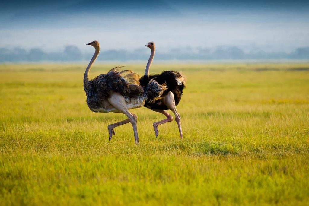 Nairobi National Park is one of the easiest places on the continent to see ostriches if someone is short on time. The park starts almost at the edge of the city, so you can be watching a pair of ostriches on open grass with high rise buildings faint in the distance. They share the plains with zebra, gazelle and rhino, and sometimes walk right across the red murram tracks in front of the vehicle. For a first timer, it feels slightly surreal to meet a wild ostrich before lunch and be back in a city hotel by afternoon.
