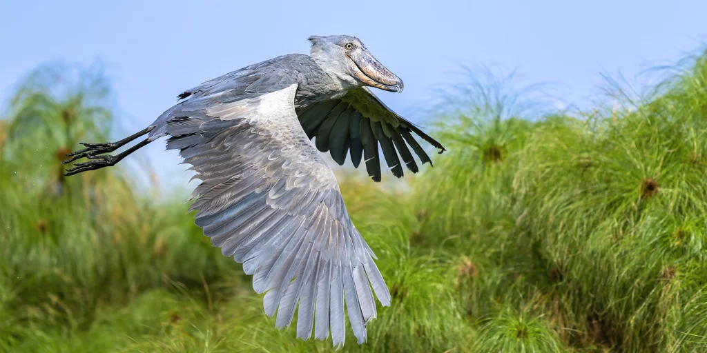 In the air, the Shoebill Stork changes character again. Take off can look a little heavy, as if the bird needs a few strong wing beats to convince itself that flying is worthwhile today. Once it gains height, though, the Shoebill glides with broad wings and a drawn-back neck, looking almost like a distant relic from another time. You might find yourself following it with your eyes longer than you expected, watching that large shape pass across the sky until the reeds swallow it up again.